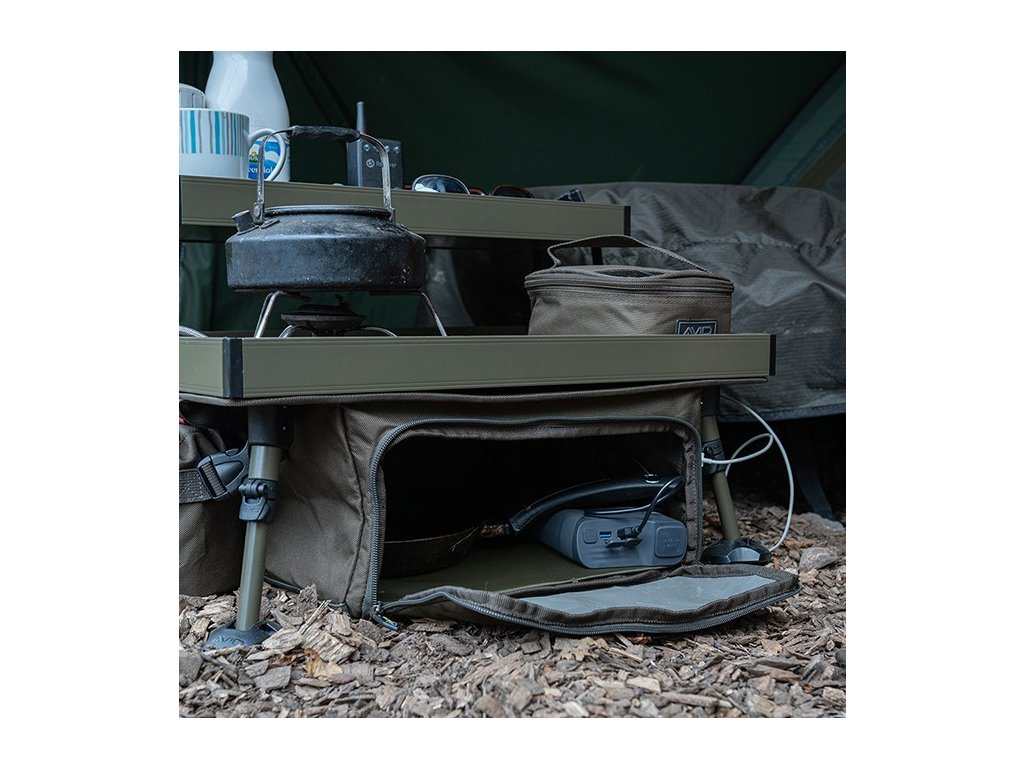 Pokud hledáte větší úložiště pro vaše vybavení, které chcete mít v bivaku při ruce, tak jste jej nyní našli. Dolní přihrádka organizéru obsahuje 2 USB porty, díky nim můžete mít cenné Powerbanky uloženy ve spodním šteláři a zárověň nabíjet svá zařízení na horní desce organizéru. Spodní přihrádka je ideální pro skladování rozměrnějšího nádobí na vaření a vaření. Double Decker Bivvy Organizer je dodáván také s externím pouzdrem na plynovou kartuš, které lze připnout z obou stran organizéru.