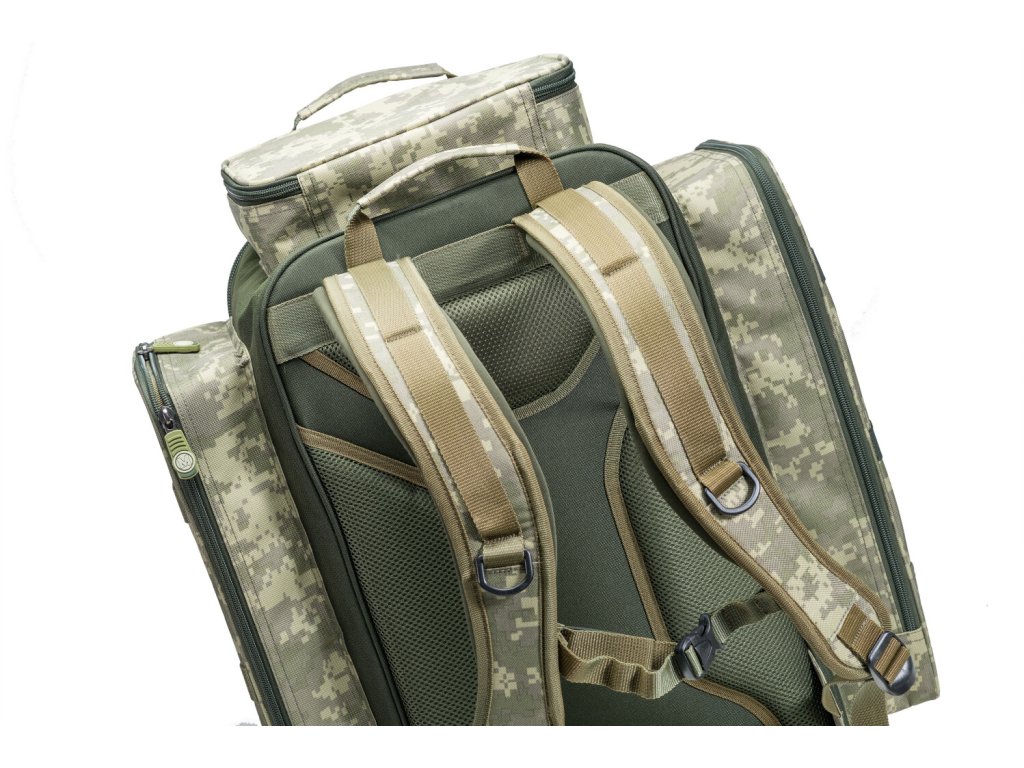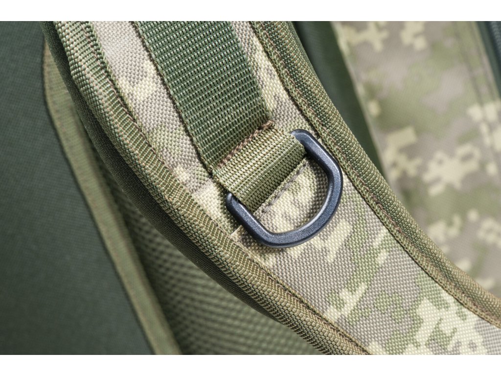 Je uzpůsoben ke snadnému zasunutí pod lehátko. Hlavní komora je snadno přístupná díky kompletně otevíratelné přední stěně. Pět velmi prostorných vnějších kapes umožňuje přehledné uložení systémových boxů a celé řady drobného příslušenství. Polstrované popruhy i anatomicky tvarovaná a odvětraná zádová část umožňují pohodlné nošení naplněného batohu i na delší vzdálenosti. Odolný, nepromokavý a snadno omyvatelný materiál B-POL600D v CamoCODE včetně originálních táhel zipů podtrhují prémiovou kvalitu tohoto batohu.