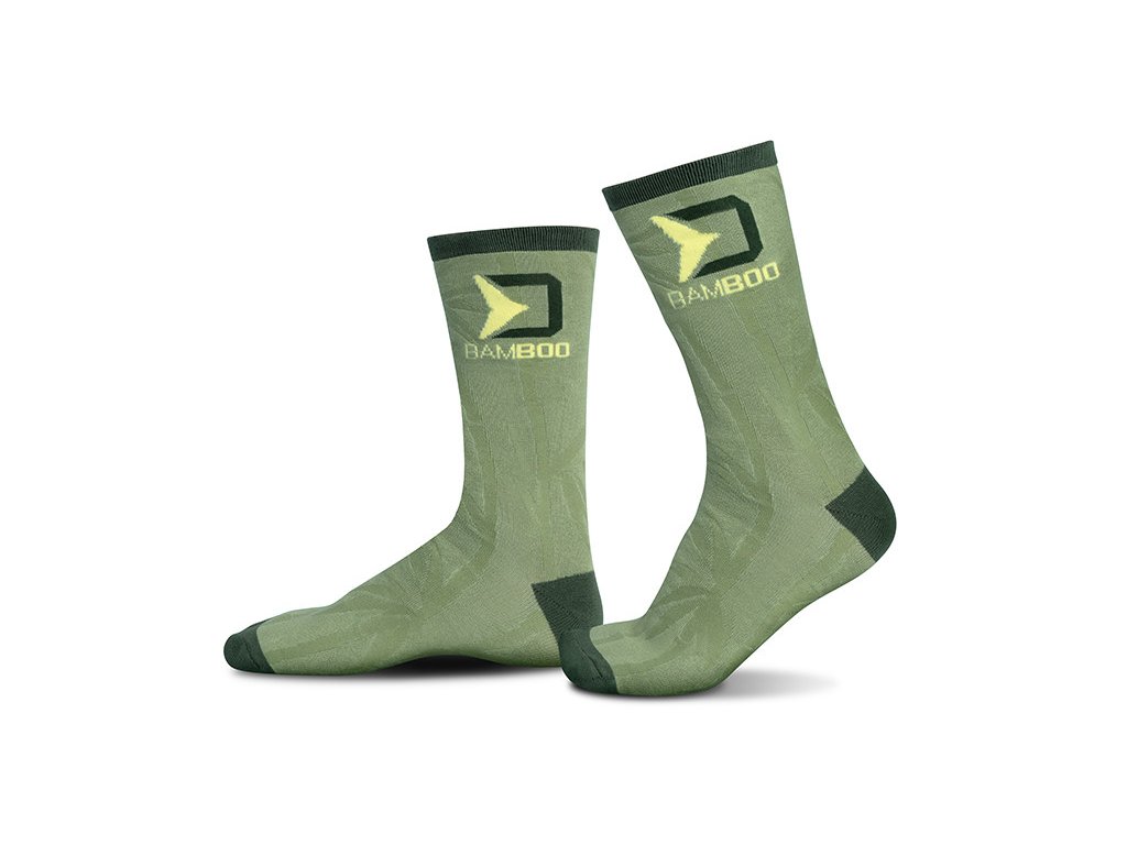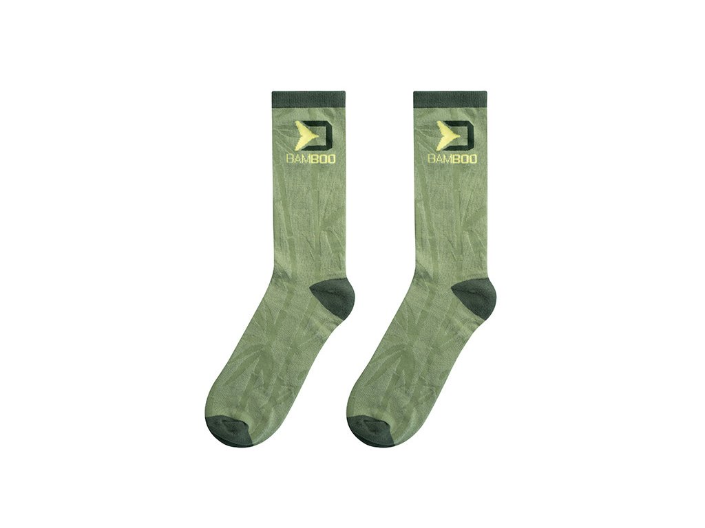 Vrchní část ponožek Bamboo je doplněna gumičkou zaručující jejich fixaci na vámi zvoleném místě na noze. Světlé části jsou doplněny zajímavým bambusovým motivem a tmavě zelenou barvou v oblasti paty, prstů a gumičky. Střihově jsou navrženy tak, aby překryly celý kotník i část lýtka.