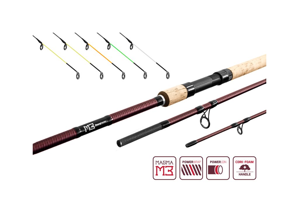 Právě to stálo za zrodem vývoje technologie Delphin 2Power. Tato technologie se skládá ze dvou podsegmentů, a to PowerWrap a PowerJoin. Oba segmenty jsou aplikovány na každém modelu série MAGMA M3. PowerWrap si všimnete okamžitě při kontaktu s prutem. Jedná se o dodatečné vinutí karbonu po celé délce prutu, kterým jsme dosáhli výrazného zvýšení pevnosti. Také zvyšuje odolnost vůči momentovému přetížení prutu. V praxi to znamená výrazně vyšší životnost prutu a snížení náchylnosti na mechanické poškození. Sekundárním aspektem tohoto vinutí je vizuálně velmi přitažlivý prvek strukturovaného blanku. PowerJoin není tak nápadným detailem jako wrap, je však neméně důležitým prvkem tohoto povedeného celku. Obnáší totiž malý kovový kroužek na konci každého spoje, což výrazně snižuje možnost tříštivého poškození blanku. Navzdory této zesilující kůře jsme zapracovali na štíhlosti blanků a tedy opět můžeme směle potvrdit, že patří jednoznačně mezi nejštíhlejší ve své třídě. Také si blanky zachovávají své nadprůměrně výborné vlastnosti z hlediska nahazování i zdolávání s parabolickou akcí. Blanky jsou osazeny kvalitními odlehčenými SiC očky, které skvěle vedou vlasec. Rukojeť je pokryta korkem, na který příjemně navazuje profilovaná hnědá EVA pěna, jejímž úkolem je nahradit korek na těch nejvíce exponovaných místech. Ukončena je elegantní hliníkovou koncovkou. Tato rukojeť dokonale padne do ruky a ještě zvyšuje komfort z používání daných prutů. Prut je osazen odlehčenými SiC očky vysoké kvality. Ty dokonale rozdělují sílu po celé délce blanku a spolehlivě vedou vlasec při náhozech nebo zdolávání ryb. Pruty jsou dodávány s pěti druhy špiček různé tvrdosti. Technické parametry: Model Light feeder 300cm / 90g Akce: C Počet dílů: 3 Průměr blanku nad rukojetí: 9,84mm Počet oček: 10 Transportní délka: 105cm Hmotnost: 184g Rukojeť: Korek a EVA pěna Délka rukojeti (od spodní části prutu po střed sedla): 43,5cm Model Light feeder 330cm / 90g Počet dílů: 3 Průměr blanku nad rukojetí: 11,78mm Počet oček: 11 Transportní délka: 115cm Hmotnost: 206g Rukojeť: Korek a EVA pěna Délka rukojeti (od spodní části prutu po střed sedla): 45,5cm Model Light feeder 360cm / 90g Počet dílů: 3 Průměr blanku nad rukojetí: 12,87mm Počet oček: 12 Transportní délka: 126cm Hmotnost: 226g Rukojeť: Korek a EVA pěna Délka rukojeti (od spodní části prutu po střed sedla): 47,5cm Model Medium feeder 360cm / 120g Počet dílů: 3 Průměr blanku nad rukojetí: 13,20mm Počet oček: 12 Transportní délka: 125cm Hmotnost: 238g Rukojeť: Korek a EVA pěna Délka rukojeti (od spodní části prutu po střed sedla): 47,5cm Model Heavy feeder 360cm / 150g Počet dílů: 3 Průměr blanku nad rukojetí: 13,61mm Počet oček: 12 Transportní délka: 125cm Hmotnost: 258g Rukojeť: Korek a EVA pěna Délka rukojeti (od spodní části prutu po střed sedla): 47,5cm Model Heavy feeder 390cm / 150g Počet dílů: 3 Průměr blanku nad rukojetí: 14,21mm Počet oček: 14 Transportní délka: 136cm Hmotnost: 286g Rukojeť: Korek a EVA pěna Délka rukojeti (od spodní části prutu po střed sedla): 49,5cm