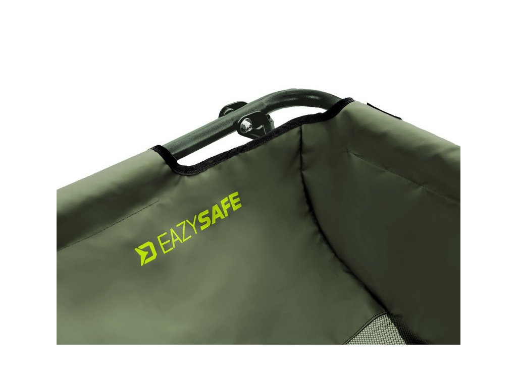 Základ podložky tvoří velmi pevná železná konstrukce s průměrem trubek až 22 mm. Díky tomu má vanička výbornou stabilitu a nehrozí její převrácení, případně poškození při manipulaci s úlovkem. Použitá látka s pogumovaným povrchem má několik výhod. Po ukončení lovu ji stačí do sucha vytřít a není tak nutné dlouho čekat dokud vyschne. Navíc je velmi snadno omyvatelná a neabsorbuje do sebe nepříjemně pachy, které se mohou následně šířit při transportu ve vašem autě. Celá vanička je velmi pevná a při extrémních testech bez problémů zvládla udržet statické závaží o váze až 75kg! Na obou krajích je všitá sítová látka, přes kterou zevnitř lehce odteče voda. EAZYSAFE také disponuje látkou na překrytí, která je opatřena suchými zipy. Můžete tak v ní rybu uzavřít, pokud si například potřebujete připravit fotoaparát, případně jít nabrat vodu na polití úlovku. Nohy jsou opatřeny kloubovými patkami, které se přizpůsobí terénu a zamezí zaboření do země v případě měkčího podkladu. Při navrhování jsme však mysleli i na transport, což je další silná stránka tohoto produktu. Ve středu je konstrukce důmyslně předělena a tak ji stačí jednoduše přeložit napůl a pomocí rukojetí pohodlně přenášet.