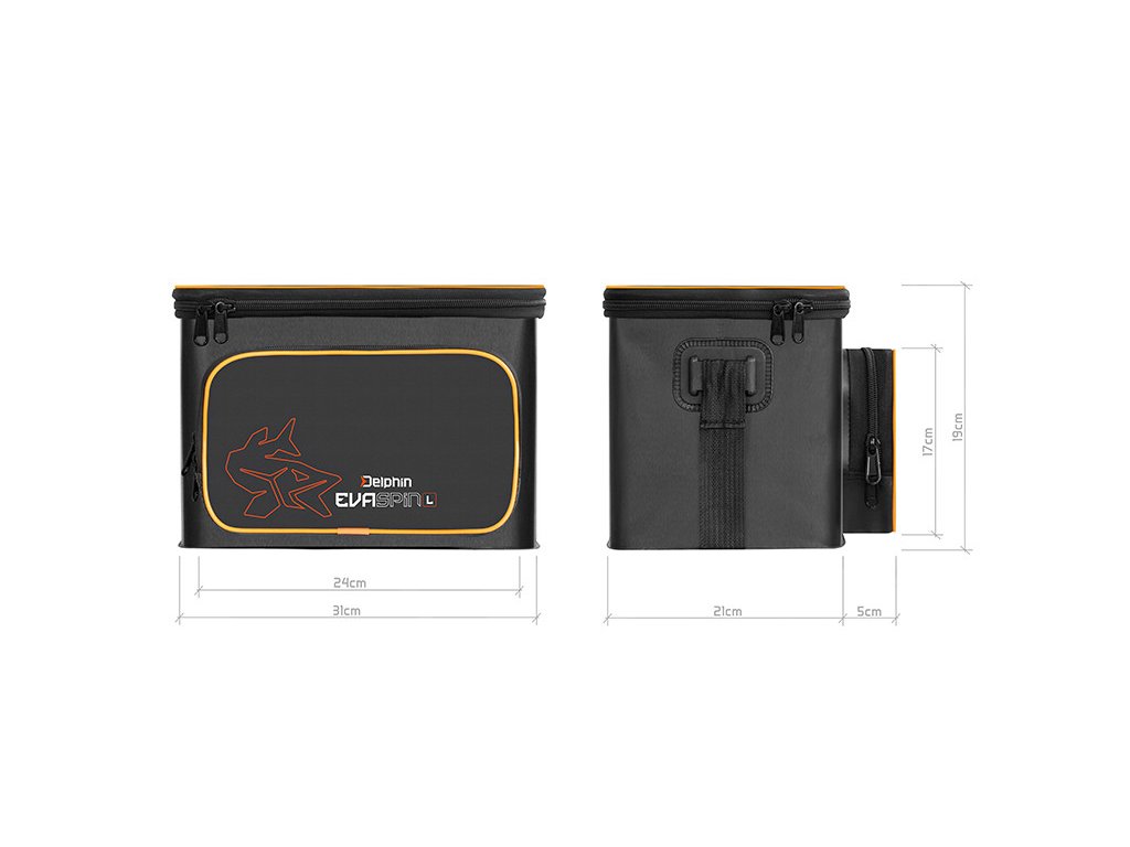 Přívlačové tašky EvaSPIN mají moderní design v kombinaci černé a šedé barvy, kterou doplňují oranžové prvky, jako například logo s vyobrazením štiky. Pro pohodlný a snadný transport je taška vybavena délkově nastavitelným ramenním popruhem.