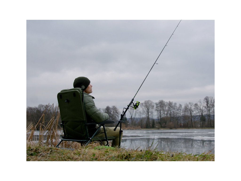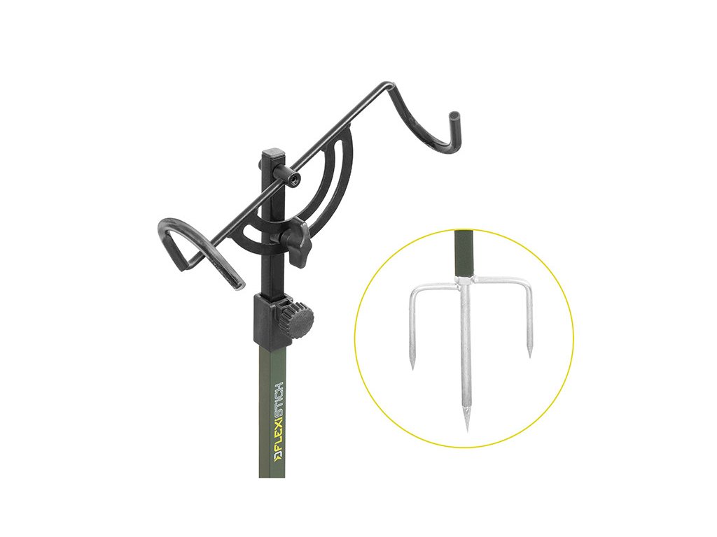 Vrchní část držící prut je vyformována z hrubého a pevného drátu černé barvy, který je specificky zahnutý tak, aby do něj bylo možné zasunout jakýkoli rybářský prut. Přední i zadní zahnutí je navíc potaženo gumou, což zamezí posouvání a zabrání poškození prutu. Držák je také polohovatelný pomocí kyvadlového mechanismu, takže si jej můžete nastavit do různých úhlů, ať už špičkou ke hladině, vodorovně nebo téměř kolmo vzhůru.