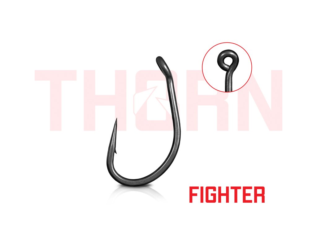 Háčky ze série THORN disponují titanX povrchovou úpravou, čímž nabývají matný šedý povrch, který je navíc dokonale hladký pro snadné proniknutí do kapří tlamy. TitanX se stará také o zpevnění a odolnost celého háčku. Pomocí aplikované technologie Ultrapoint 4.8, bylo možné vytvořit delší hrot, který poskytuje přímo neuvěřitelnou ostrost. Háčky Delphin THORN jsou balené v praktické krabičce, ve které bude jejich ostří vždy důkladně chráněné. Na krabičce se navíc nachází držák s očkem pro zavěšení do prodejen, který lze snadno odstranit odlomením bez jakéhokoli nástroje díky čemuž krabička ve vaší výbavě zabere podstatně méně místa. THORN Fighter je nekompromisní háček, určený do těch nejtěžších podmínek. Díky hrubému drátu, ze kterého je vyroben má excelentní pevnost, která ho předurčuje pro použití ve vodách plných překážek, či na řekách. S Fighterem na vás čekají ty největší výzvy, při kterých si můžete být jisti, že žádný souboj není předem prohraný. Technický parametr: háček osově zakřivený