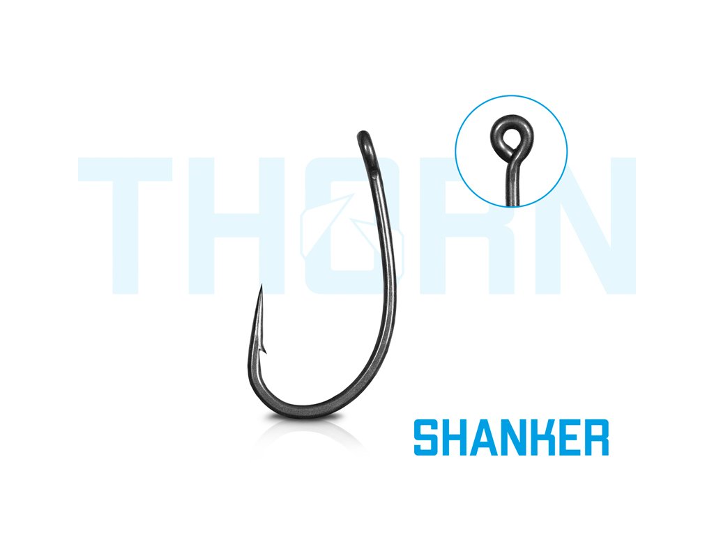 Háčky ze série THORN disponují titanX povrchovou úpravou, čímž nabývají matný šedý povrch, který je navíc dokonale hladký pro snadné proniknutí do kapří tlamy. TitanX se stará také o zpevnění a odolnost celého háčku. Pomocí aplikované technologie Ultrapoint 4.8, bylo možné vytvořit delší hrot, který poskytuje přímo neuvěřitelnou ostrost. Háčky Delphin THORN jsou balené v praktické krabičce, ve které bude jejich ostří vždy důkladně chráněné. Na krabičce se navíc nachází držák s očkem pro zavěšení do prodejen, který lze snadno odstranit odlomením bez jakéhokoli nástroje díky čemuž krabička ve vaší výbavě zabere podstatně méně místa. THORN Shanker je díky svému tvaru typickým zástupcem háčků z kategorie curved shank. Háček s takovým zakřivením je doslova zasekávací mašinou a při správně navázané montáži se Shanker, si můžete být jisti, že ztrátovost ryb se bude blížit k nule. Ideálně se hodí pro lov s potápivými nástrahami, ale také ho lze použít při chytání s pop-up. Technický parametr: háček osově rovný