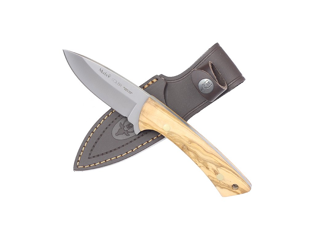 Lovecký nůž Muela COL-9.Olivový olej je full-tang tj vyrobený z jednoho kusu oceli s pevnou čepelí s hladkou hranou z molybden-vanadové oceli. Rukojeť je z olivového dřeva se záštitou a dírkou na šňůrku. Dodává se s koženým pouzdrem.