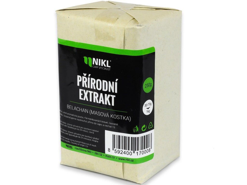 Nikl Belachan masová kostka 250g je lisovaný, rozpustný blok z autentické fermentované krevetové pasty, která je ceněná pro svůj extrémně výrazný masový profil a schopnost dramaticky zvýšit atraktivitu jakékoli nástrahy či návnady. Díky širokému spektru použití se skvěle hodí k obalování boilies, strouhání do PVA i jako silná přísada do boilies směsí, kde dokonale podpoří jejich vůni i chuť. Pro maximální efekt doporučujeme 75 g na 1 kg suché směsi, nastrouhaný belachan rozmíchat ve vejcích a nechat 10–15 minut rozpustit před přidáním mixu.