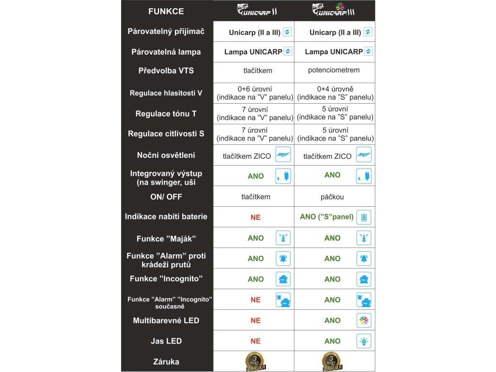 Unicarp II disponuje nejen originálním vzhledem, ale řadou UNI-kátních funkcí reflektujících potřeby předních kaprařů, ale i obecné požadavky běžných rybářů např. funkce "Delay" 30s pro nastavení indikátorů; "Incognito" -indikace záběru pouze na přijímači; "Lighthouse" pro lokalizaci lovného místa při zavážení, "Alarm" proti krádeži prutů; "Drop back" funkce- zpětný záběr (padák) indikovaný "V" LED panelu a zvukem. Celé ovládání probíhá intuitivně tak jako u předchozího modelu. Pro přehlednost byl tento model vybaven pro zapnutí a vypnutí indikátoru a jeho modifikaci nočního osvětlení, rolničky a paměťové diody dalším tlačítkem - ZICO. Tímto se značně zjednodušila volba jednotlivých funkcí i při ztrátě návodu. Napájení je řešeno 9V baterií, která je volně dostupné ve většině obchodech, nicméně životnost baterie určuje používání indikátoru. (vzdálenost mezi indikátorem a přijímačem, používání přední zavážecí diody apod.) Na přijímač lze snadno napárovat až 6 indikátorů s unikátním kódováním. Jednotlivé indikátory Unicarp II lze párovat i na předchozí přijímač setů UNICARP (ID UNI 2 UNI 3) a to stejným způsobem. Dostupnost pro jednotlivé indikátory řady Unicarp II je docílena prodloužením antény v jeho těle a dosahuje více než 200m. Vice o jednotlivých funkcích se dočtete v návodu viz."přílohy ke zboží" Výrobek se dodává v kufříkových sadách 2+1 (červená + modrá; ID UNIC 2) nebo 3+1 (červená, modrá, zelená; ID UNIC 3) jednotlivě lze k přijímači dokoupit jednotlivé barvy indikátorů Unicarp II (k dispozici červená, modrá, zelená a žlutá; ID UNIC R-G-B-Y )